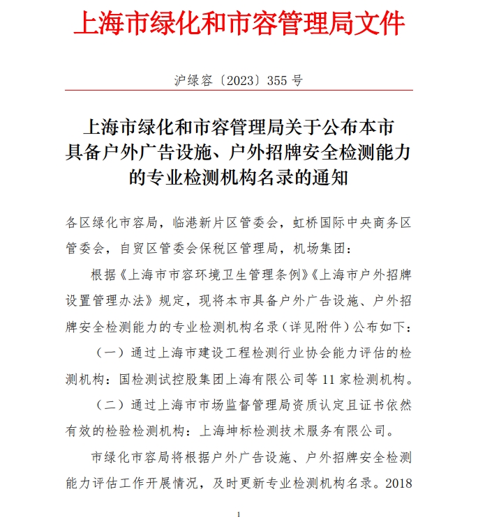 鈞測成功入圍上海市綠化和市容管理局的戶外廣告設施、戶外招牌安全檢測機構名單!